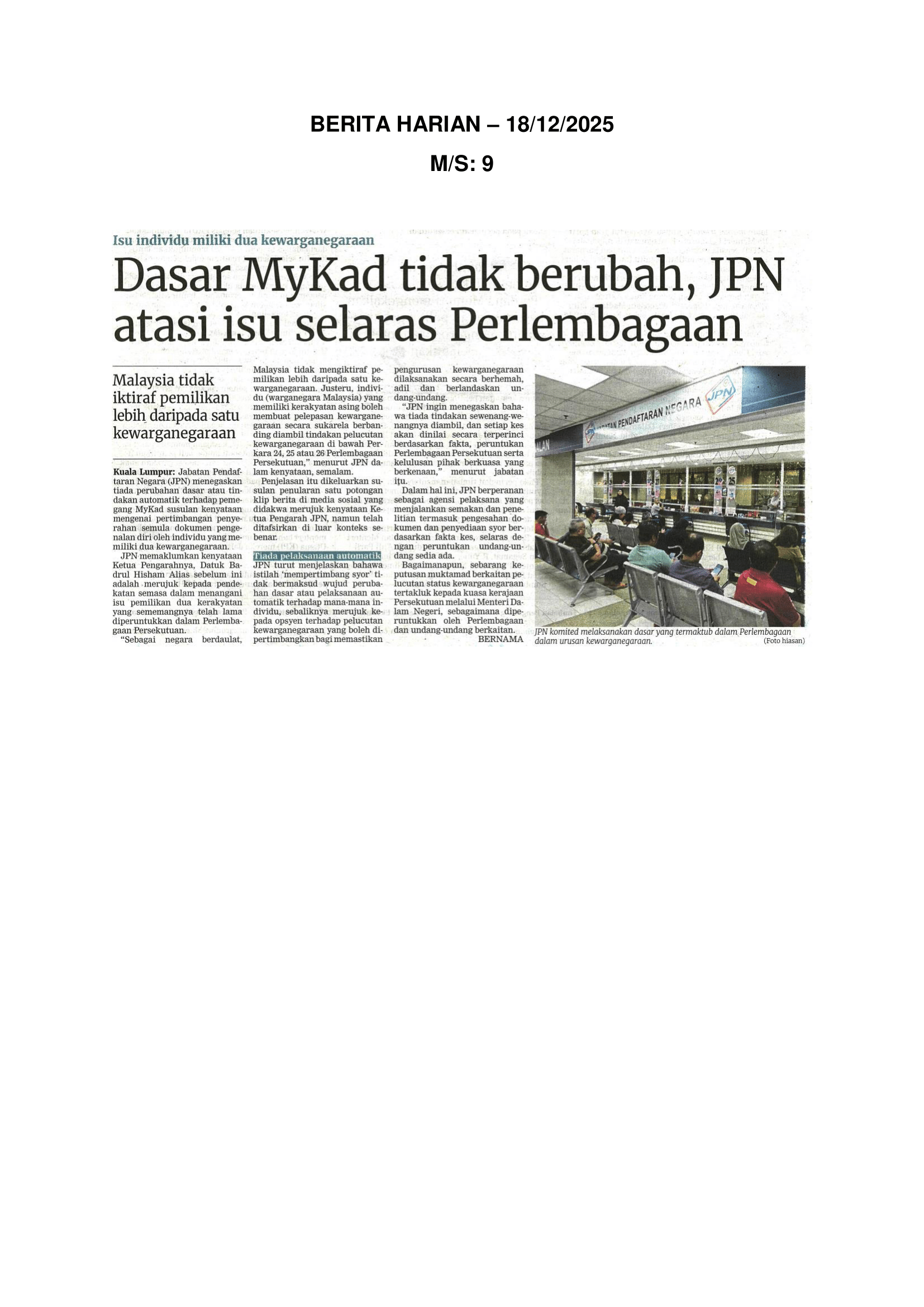 Dasar MyKad tidak berubah, JPN atasi isu selaras Perlembagaan