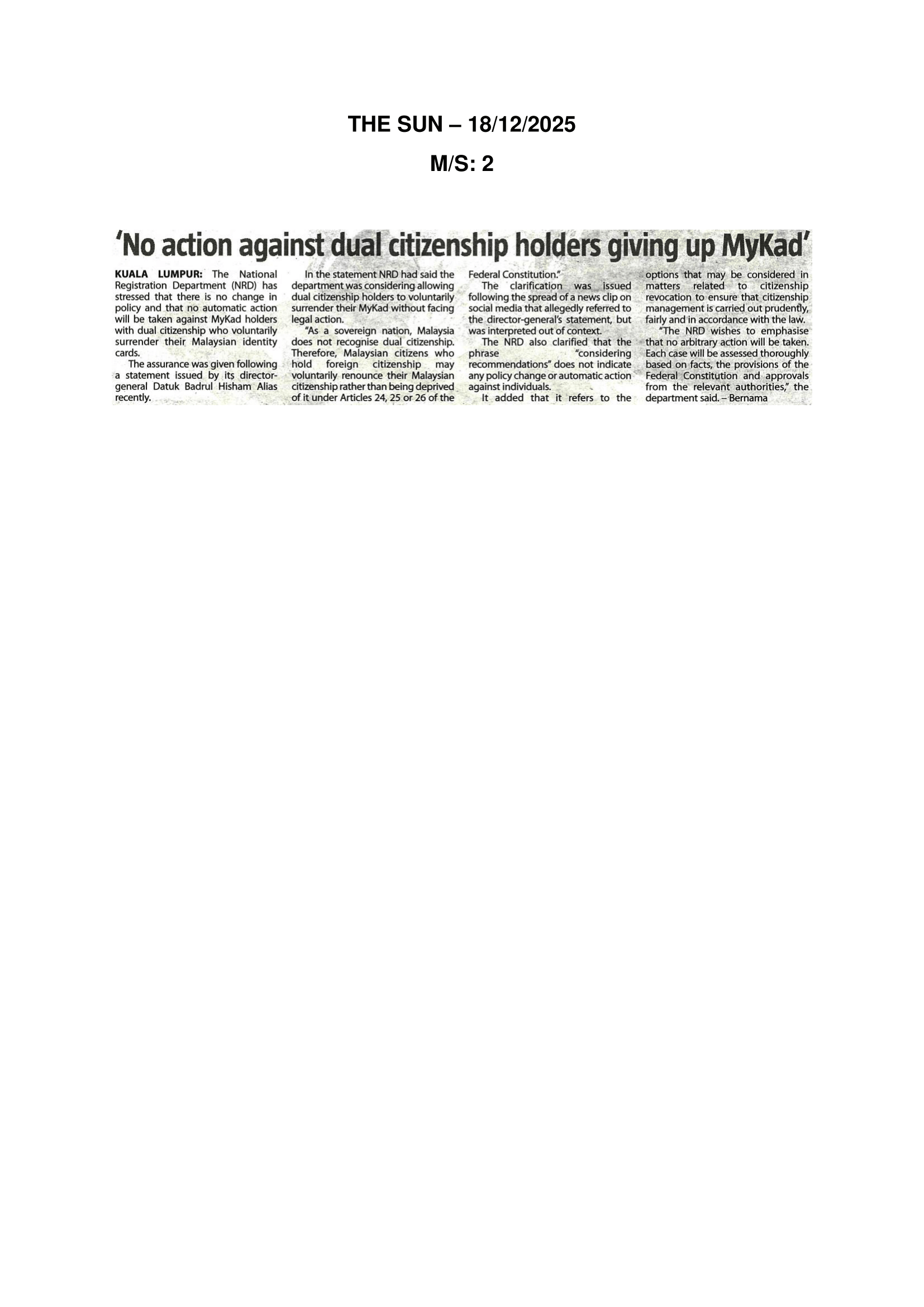No action against citizenship holders giving up MyKad